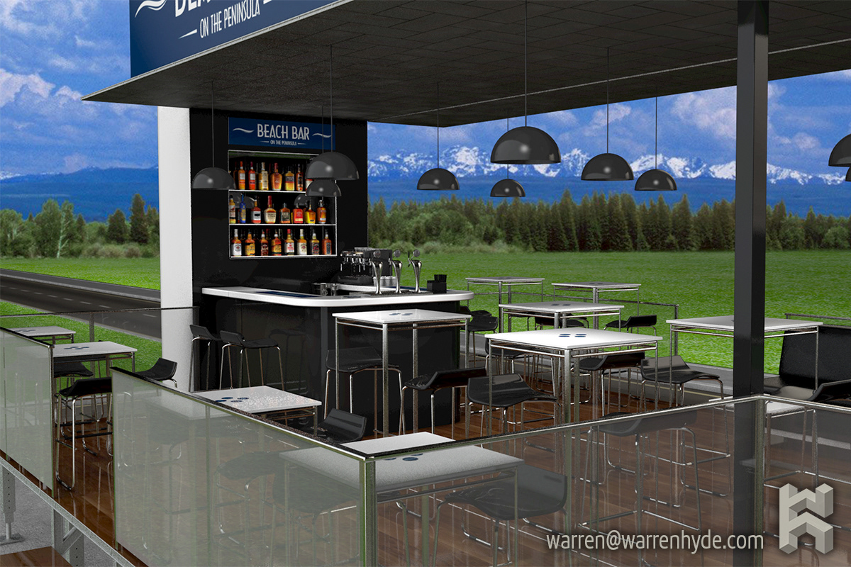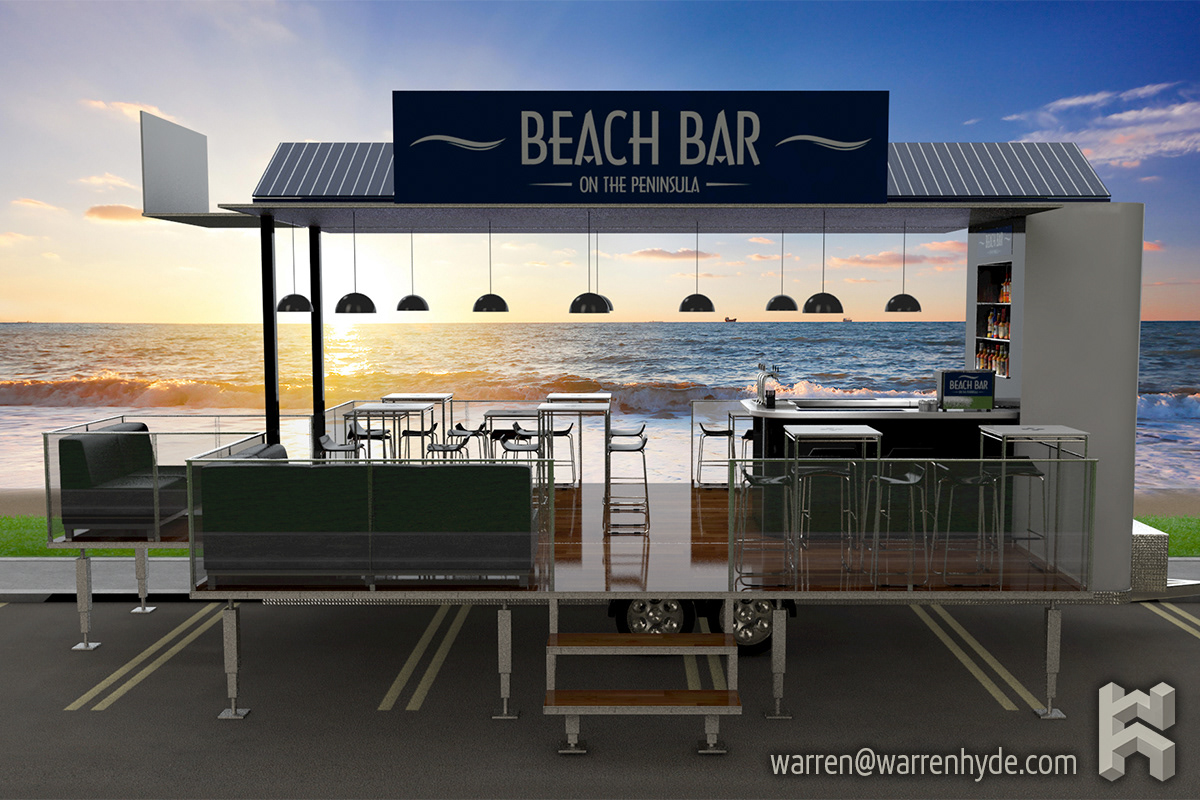 a visualisation for a portable trailer bar. the brief was to design and render a classy beachside bar which unpacks from a small footprint. the project took just over 20 hours to complete.