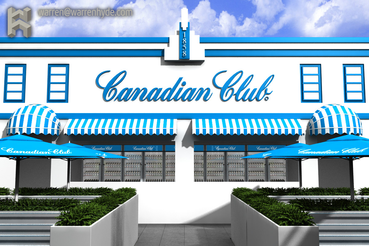a picturesque bar setting for Canadian Club, featuring day beds and leafy alcoves